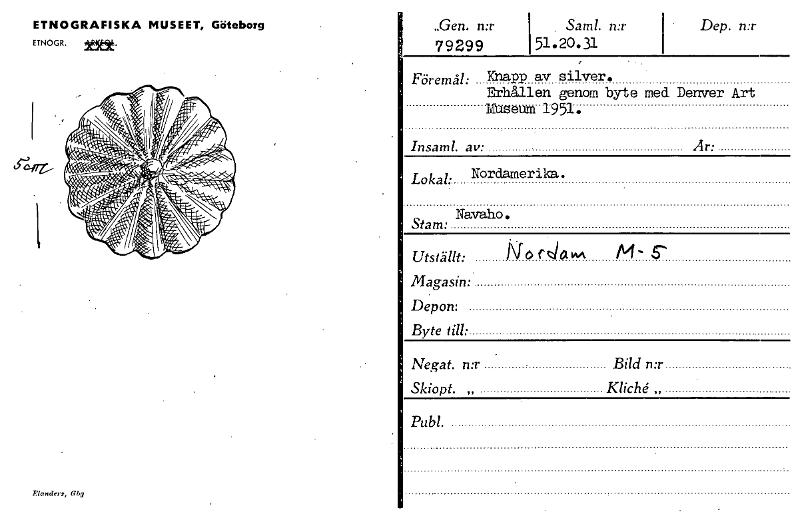 • ETNOGRAFISKA MUSEET, Göteborg ETNOGR. R. _Gen. n:r . Saml. n:r 1 Dep. n:r 79299 51.20.31 I Föremål: Knapp av silver. Erhållen genom byte med Denver Art Museum 1951. Insaml. av: År: Lokal: Nordame... Visa hela