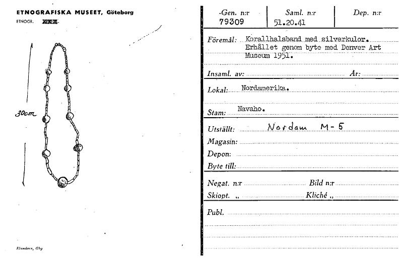 • ETNOGRAFISKA MUSEET, Göteborg ETNOGR. ZIKZ. -Gen. n:r 79309 Sam!. n:r 51.20.41 Dep. n:r Föremål: Kårallhalsband med si1verkulor. Erhållet genom byte med Denver Art Museum 1951. Insaml. av: Är: Lok... Visa hela