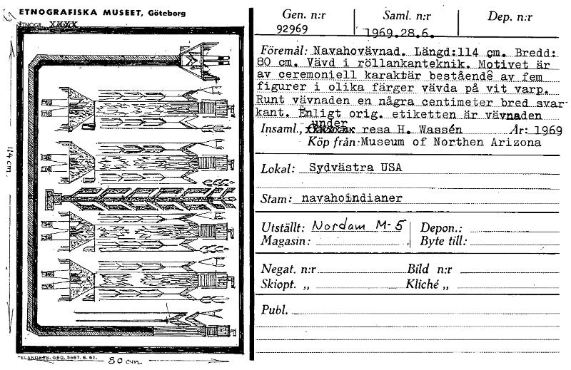 ETNOGRAFISKA MUSEET, Göteborg Gen. n:r 92969 Saml. n:r [ 1 969.2.R.6, Dep. n:r Föremål: ..Navahcvävna.d._...L.ängd:114 80 cm. Vävd i röllankanteknik. av ceremoniell karaktär bestående figurer i olika färger vävda Runt vävnaden en några centimeter kant. n.limt orig..___ etiketten Insaml.• t;:;J,,::: E, __r_e_s_a__11._ Was_sån Köp från:Museum of Northen 6m.....3redd.:_. Motive_t_är.._ av fem på vit varp. bred....svas är vävnaden Är: 1969 Arizona Lokal: Sydvästra USA ------ Stam: navahoindianer Utställt: A)ordatA4 14- 6" Byte till: Depon.: Magasin: , Negat. n:r Bild n:r Skiopt. „ KlicU „ • Publ. GE1G. 5687. 8. 61. 5 0 A _ n 3 [ocr]Stäng