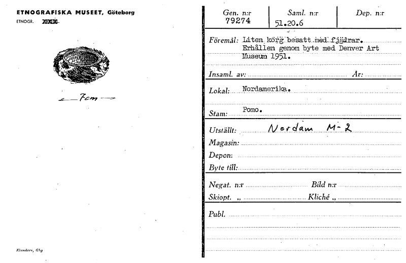 • ETNOGRAFISKA MUSEET, Göteborg ETNOGR. zlaaa. Gen. n:r Saml. n:r Dep. n:r 79274 51.20.6 Föremål: .Liten. _inkl:fjädrar. Erhållen genom by-te med Denver Art Museum 1951. Insaml. av: Är: Lokal: Nordam... Visa hela