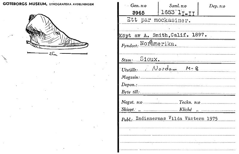 • GOTEBORGS MUSEUM, ETNOGRAFISKA AVDELNINGEN • Gen. n:o 3965 Samt. n:o Dep. n:o 1653 '1-IT Ett par mockasiner. Köpt av A. Smith,Calif. 1897. Stam • Sioux. Publ.: Indianernas Vilda Västern 1975 Fyndort:,... Visa hela