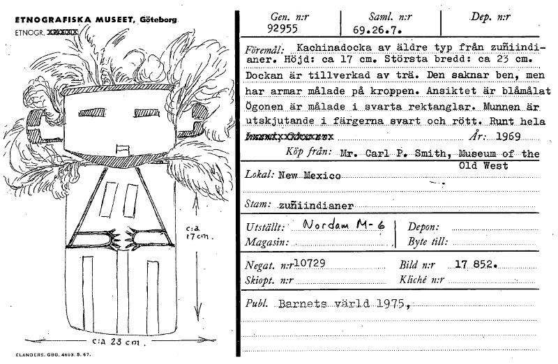 ETNOGRAFISKA MUSEET, Göteborg. ETNOGR. Gen. mr 92955 I Samd. mr Ikp. mr i 69.26.7. Föremål: Kachinadocka av äldre typ från zufiiindi- aner. Höjd: ca 17 cm. Största bredd: ca 23 cm. Dockan är tillverkad av trä. Den saknar ben, men har armar målade på kroppen. Ansiktet är blåmålat Ögonen är målade i svarta rektanglar. Munnen.är utskjutande i färgerna svart och rött. RUnt_hela fflamcdpadmixxox Yr. 1969 Kip från:.. Mr.-Oarl P.-Smith MUseum .of the Old West Lokal: New Mexico Stam: zunindianer a Utställt:- Vo rcla 614 61- 6 Depon: r 7 uh Magasin: . Byte till: Negat. n:r-0729 Bild n:r 17 85.2* Skiopt. n:r Kliché n:r Publ. ..Barnets...vär1d...19.75, • ( Ca 23 c ni ELANDERS, GBG. 4693.5.67. [ocr]Stäng