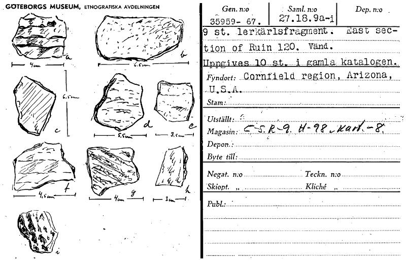 GOTEBORGS MUSEUM, ETNOGRAFISKA AVDELNINGEN Gen. n:o : Samt. n:o Dep. n:o , 35959_ 67. 27 .18• 9a-j. 9 st, lerlarlsfragment• east sec- t ion of Ruin 120. Vänd.. TTppgi ves 10 st. i garraa,• katalogen. ...