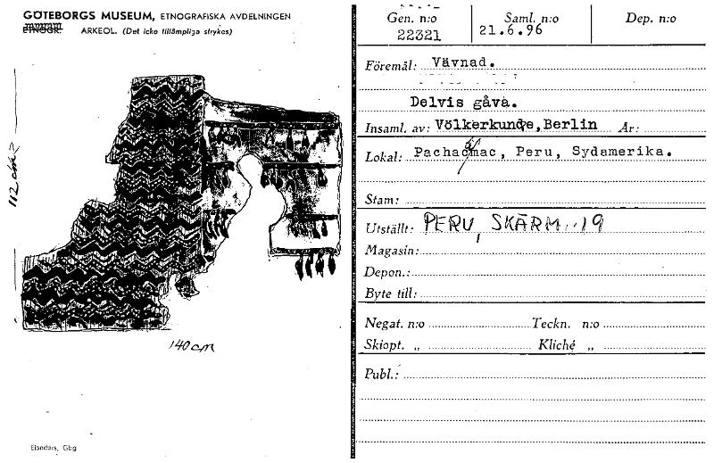 • GCITEBORGS MUSEUM, ETNOGRAFISKA AVDELNINGEN ggilffR" ARKEOL. (Det icke tillämpliga strykes) /410a771 Ebnders, Gbg Gen. mo 22321 Samt. n:o 21. 6.96 Dep. n:o Föremål: Vävnad. - - - Delvis gåva. Insaml.... Visa hela