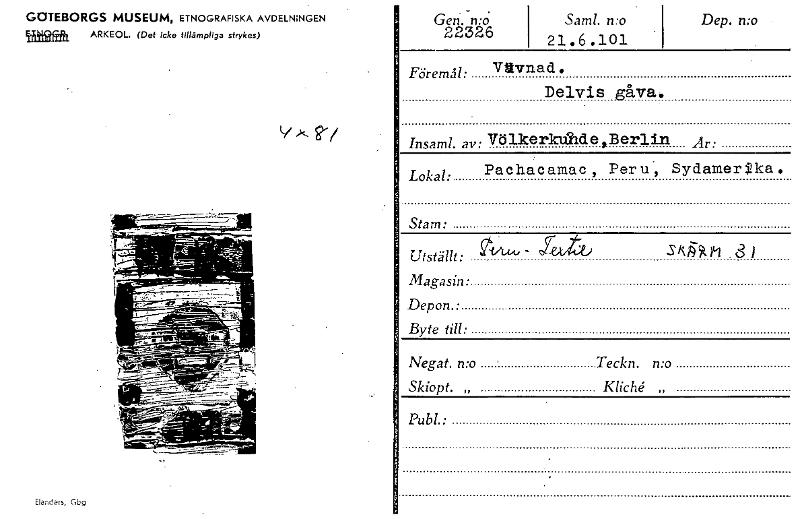 • GOTEBORGS MUSEUM, ETNOGRAFISKA AVDELNINGEN 52125fi ARKEOL. (Det icke tillämpliga strykes) v Elanders, Gbg Gen. n:o 22326 Saml. n:o 21.6.101 Dep. n:o Föremål: Vävnad. Delvis gåva. Insaml.av. .Völkerka... Visa hela