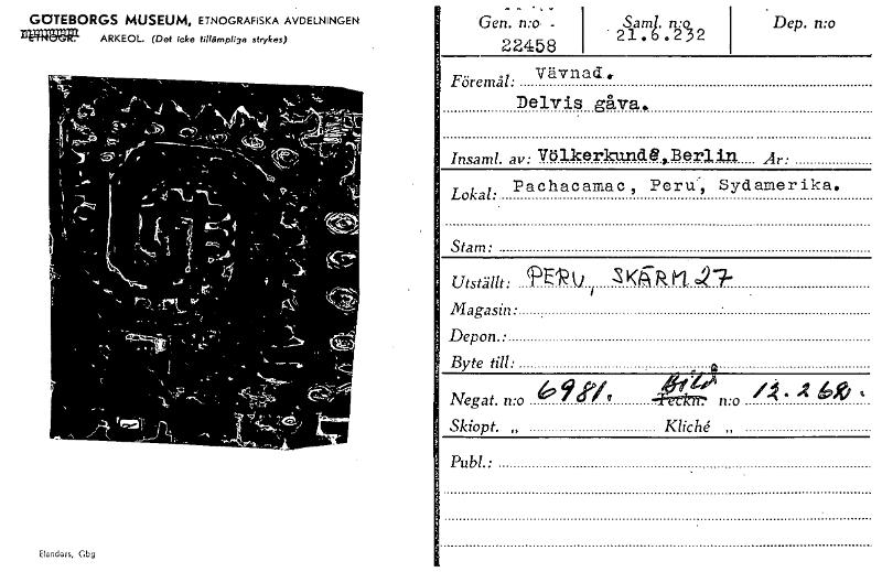 GOTEBORGS MUSEUM, ETNOGRAFISKA AVDELNINGEN 114gägg ARKEOL. (Det icke tillämpliga strykas) Elanders, Gbg Gen. n:o. - 22458 2.1. Samt. ons 2 Dep. n:o Föremål: Vävnad. Delvis gåva. hisamLaw:VölkerkandA...