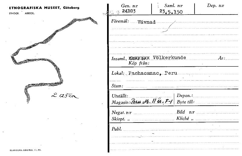 Dep. n:r ETNOGRAFISKA MUSEET, Göteborg ETNOGR. ARKEOL. ELANDERS, GOD 502. 11.53. Saml. n:r 234 5.150 Gen. n:r 24,103 Utställt: Magasin :2(. A. // ä.1 Depon.: Byte till: Negat. n:r Bild n:r Skiopt. „ Kliché „ Publ. Föremål: Vävnad Insaml., nRucw Völkerkunde Köp från: Lokal: Pachaeamact Peru, Stam: År: [ocr]