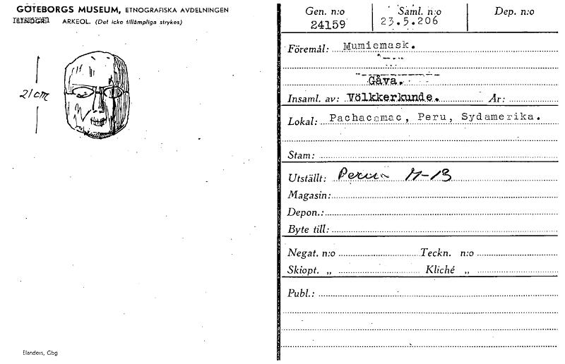 • GOTEBORGS MUSEUM, ETNOGRAFISKA AVDELNINGEN rasouo ARKE0L. (Det icke tillämpliga strykes) J/ct Elanders, Gbg Gen. n:o 24159. Sam. 1. ii:o 23.5 . 206 Dep. n:o .Föremg: Mumiemask. ... Gava..., Insaml. a... Visa hela
