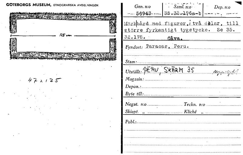 GOTEBORGS MUSEUM, ETNOGRAFISKA AVDELNINGEN ,4e 7- A i 2- ,5"-- Gen. n:o ----- 569,43- ---- Samt. n:o • - 3,5-.52-.-19 .6.ek-b• ■ . Dep. n:o --, , - . --- - 1.413..r.d_md_figu= ,; två dålar, till större fyrkantigt tygstycke. Se 35. 32.178,. - Gåva. Fyndort: Paraeas I *Peru • Stam • . Utställt. ri; Skiii4 M 3 5 ...- ,,riLj, ,'1:3-. - I 4' 0 Magasin: Depå. • Byte till: Negat. n:o Teckn. n:o . ' Skiopt. „ KlicU „ Publ • [ocr]