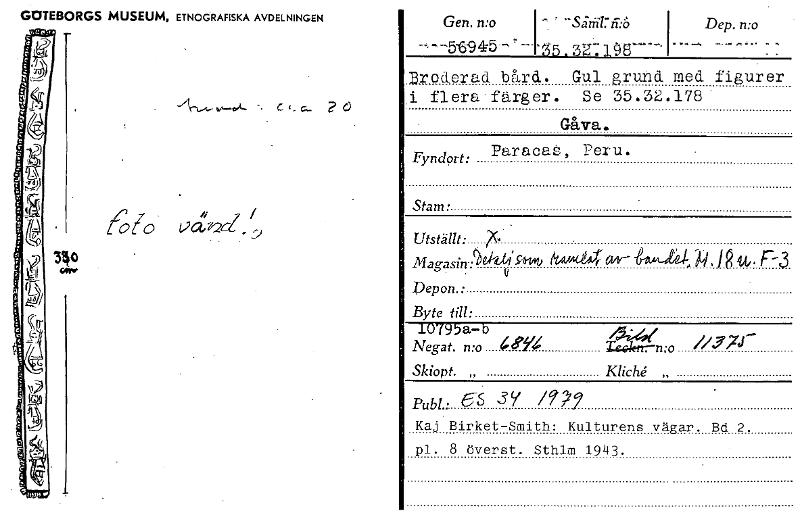 • GOTEBORGS MUSEUM, ETNOGRAFISKA AVDELNINGEN -. c t. 2 c.) Gen. n:o ' -Såstrir ri:6 Dep. n:o --5-6945-" '" g5.3Z. 19 E3—' oder ad bård. Gul gruhd med figurer i flera färger. Se 35.32.178 Gåva. Paraca:.... Visa hela