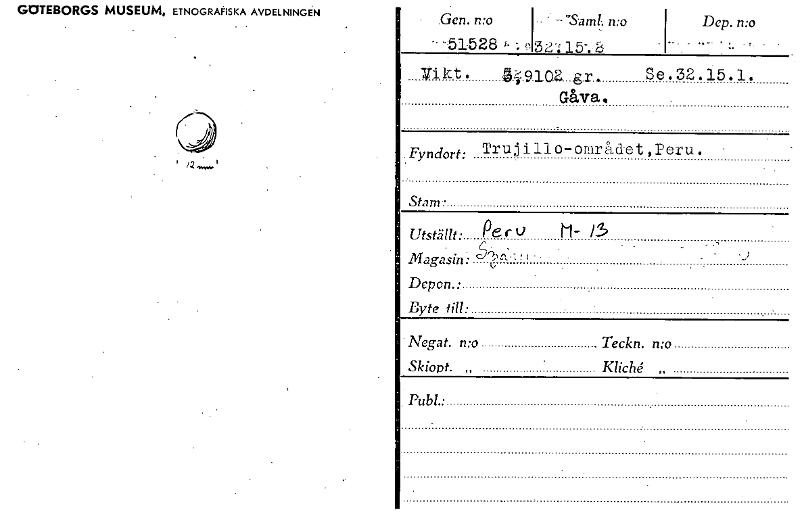 GOTEBORGS MUSEUM, ETNOGRAFISKA AVDELNINGEN .Gen. n:o - • - 'Samt: n:o Dep. n:o 515,W.,32;15-.6 "Vikt. 30102 gr. Gåva, Se.32.15.1. ' . Fyndort : Trujillo-området,Peru. Stam. Utställt. Magasin: Depon....