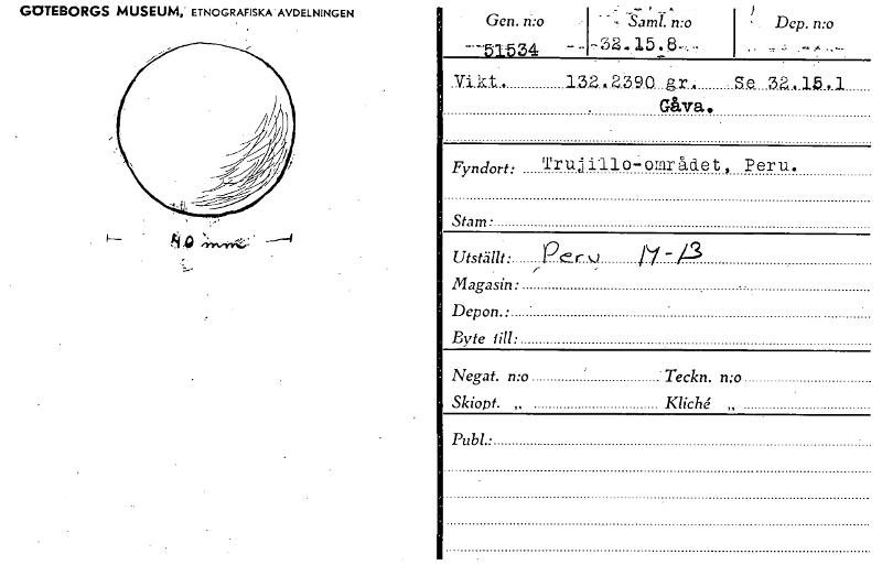• GOTEBORGS MUSEUM,' ETNOGRAFISKA AVDELNINGEN 4.0 —4 ; -Samt. n:o -32.15. g.r S.e_ 32 Gåva, Fyndort: Trujilloområdet, Peru. Stam • Utställt • Magasin: Depon • Byte Negat. n:o * Teckn. n:o Skiopt. „ ... Visa hela
