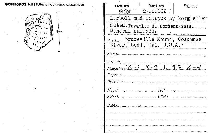 • GOTEBORGS MUSEUM, ETNOGRAFISKA AVDELNINGEN Gen. n:o 5Yfo5 Sam!. n:o 27. 6.102 Dep. n:o Lerboll med. intr,T.ck. av korg eller matta. insaml,: E.' Nordenskiöld, General su:gace. Fyndort: Eruc ev ill e M... Visa hela