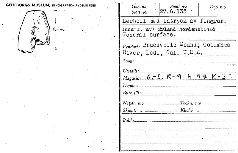 • GOTEBORGS MUSEUM, ETNOGRAFISKA AVDELNINGEN G5-41,1A., Gen. n:o 734164 Sarg n:o 27.6.135 ' Dep. n:o Lerboll med intryck av fingrar. Insaml. av: Erland Nordenskiöld general surface. Fyndort: Brucev ilie... Visa hela