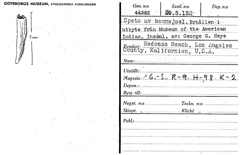 GOTEBORGS MUSEUM, ETNOGRAFISKA AVDELNINGEN Gen.nw .44382 Saml.wo . Dep. n:o pe=t;:., a:be-rim° js el . Erhållen-i- - utbyte 'från- MUS eum of-- the- American Indian. Insåml. av: George G. Heye 5mdort:...