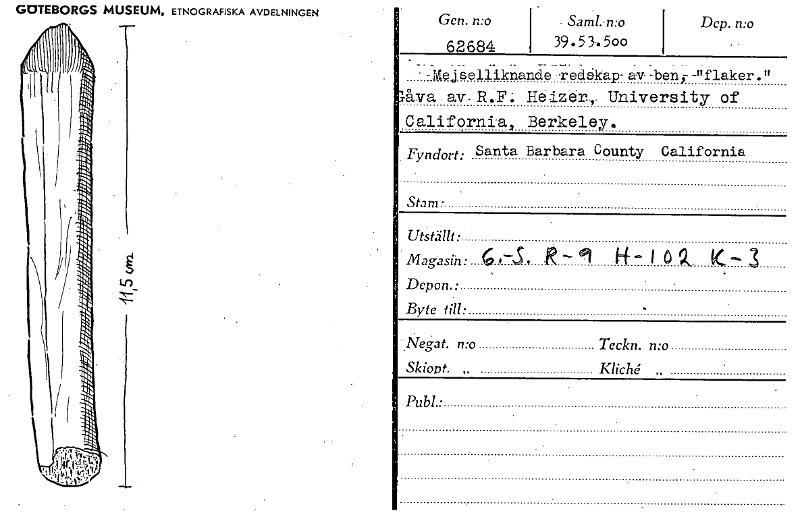 • GOTEBORGS MUSEUM, ETNOGRAFISKA AVDELNINGEN Lr) • Saml..n:o 39.53.5oo Dep. n:o -Mej selliknande -redskap- av- -bene -"flaker." åva av.R.F. Heizer, University of California, Berkeley. Fyndort: Santa B... Visa hela