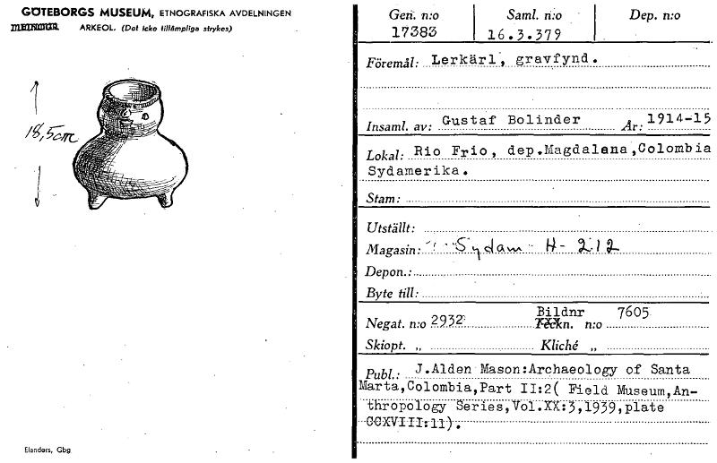 GOTEBORGS MUSEUM, ETNOGRAFISKA AVDELNINGEN 2~12) a. ARKEOL. (Det icke tillämpliga strykas) Elandars, Gbg Ged. 'n:o 17383 Saml. ri:o 16.3.379 Dep. n:o Föremål: Lerkårl, gravfynd . Gustaf Bolinder 1914-,15 Insaml. av: Ar: Lokal: Rio Frio 3 dep .Magdalana ,Colomb ia Sydamerika. Stam: Utställt: Magasin: - ' ti a 14- 1;1 g.. Depon. • Byte till: Bildnr 7605. Negat. mo 2932' TeTabL ruo Skiopt. „ Kliché ” Publ.. J.Alden Mason:Archaeology of Santa Marta,Colombia,Part 11:2( Field Museum,An- thropology Series,Vol.XX:3,1939,plate -GOXVIII:11). [ocr]