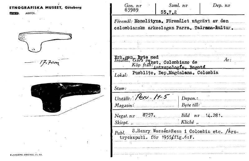 ETNOGRAFISKA MUSEET, Göteborg emmaz. ARKEOL. P Gen. n:r 83989 ISam!. n:r 55.7.2 Dep. n:r Föremål: Monolityxa. Föremålet utgrävt av den colombianske...arke.ologen..Parra,...Tairana4raltur. n"...kte med ' `Java aäilat , Colomb iano de Köp fran:&ntr npni ne BneotO År: Lokal: Depadagdalana, Colombia Stam : Utställt: /5"-• Magasin Negat. n:r 8757. Bild n:r 14.28.1.. Skiopt. „ Kliché „ Publ. S.Elenry. Wae.sen:Resa i Colombia, etc. /Ära- tryckepubl. för 1955Xfig .6:F. Erh. insar Depon.: Byte till:• ELANDERS. GG 502. 1 1. 53. [ocr]Stäng