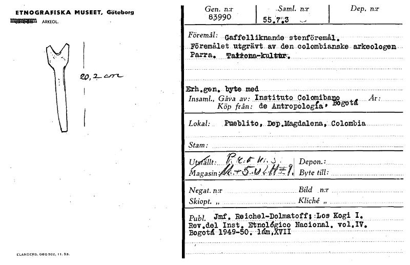 ETNOGRAFISKA MUSEET, Göteborg ARKEOL. ELAND ERS. GOG 502. II. 53. Gen. n:r 83990 i • -Saml. n:r 55,73 Dep. n:r Föremål: _ Gaffelliknandwatenföremål„ _Föremålet utgrävt. av_den_colombianske-arkeologen-...