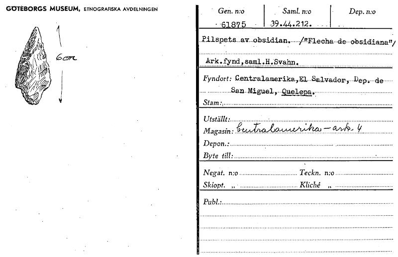 • GOTEBORGS MUSEUM, ETNOGRAFISKA AVDELNINGEN Gen. n:o - 61875 • Samt. n:o 39.44.212. Dep. n:o 6 j Pilspets av obsidian. /"Flecha de•obsidianall/ Ark.fynd,saml.H.Svahn. Fyndort: Centralamerika.,E1-Salvad... Visa hela