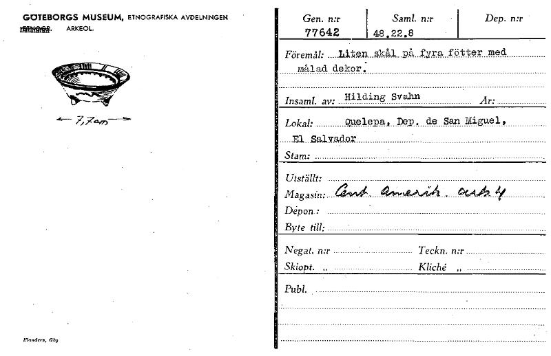 • GOTEBORGS MUSEUM, ETNOGRAFISKA AVDELNINGEN rfificke. ARKEOL. Gen. n:r 77642 Saml. n:r 48.22.8 Dep. n:r Föremål: Liten Skål på fyra fötter med. målad dekor, Insaml. av: Hilding Svahn Lokal: Quelepa... Visa hela