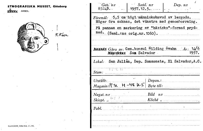 Gen: -n:r 8520 • - I • Sartd. n:r I I 1957.12.5._ Dep. n:r _ • ETNOGRAFISKA MUSEET, Göteborg Atgetx ARKEOL. Föremål.. -5,5-cm.högt.-människohuvud av lergods, Högar. öra saknas, dat vänstra med genomborrning. På pannan en markering av "hästskon-formad pryd- nad. (Saml.:ns orig.nr.1060). , »§ä1#4.›F Gåva av: Gen.konsul Hilding Svahn Ar 1 Nagneimx Sam Salvador 1957. Lokal.. San Juliån, Dep. Sonsonate, El Salvador,A.C. .Sta m : Utstänt: Magasin:71-7k H — 4 % V.-57 Depon.: Byte till: Negat. n:r Bild n:r Skiopt. „ „ Publ. ELANDERS. GE1G 502. 11. 53. [ocr]
