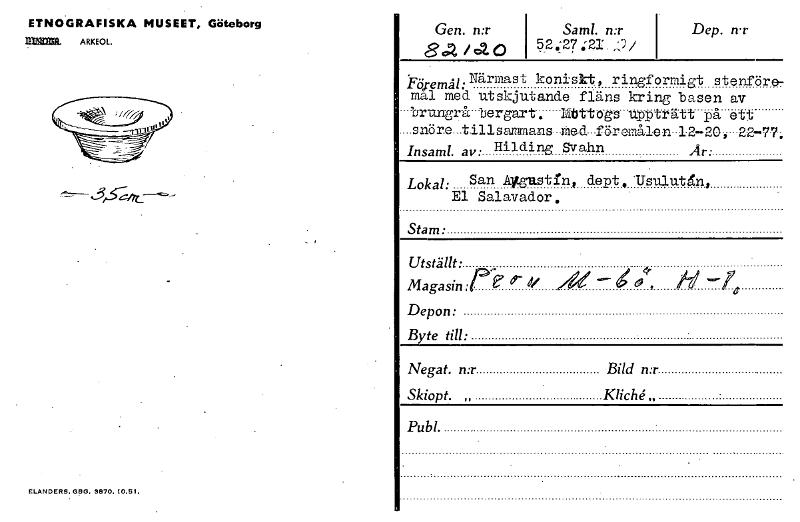 ETNOGRAFISKA MUSEET, Göteborg MIM ARKEOL. ELANDERS. GBG. 9870. 10.51. Gen. n:r 84, ,a0 Saml. n:r i 5_2:27:21 ,.), Dep. n.r *Färemål:Nä,rmast koniskt, ringformigt stenföre- mal med *utskjutande fläns kring basen av r brungrå bergart. ribttogs upptratt på ett snöre tillsammans med föremålen 12-20, 22-77; : Insaml. av • Hilding Svahn Är.: Lokal: San Algustrn, deist, Usulutgn, El Salavador, Stam: Utställt: 4- Magasin; e i , e- Depon: Byte till: Negat. n:r Bild n:r Skiopt. „ Klich.„ Publ. - [ocr]