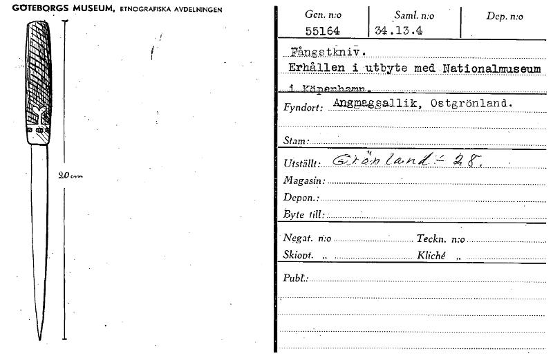 • GOTEBORGS MUSEUM, ETNOGRAFISKA AVDELNINGEN Gen. n:o 55164 Sam!. mo 34 13 . Dep. mo •14åristkniv. Erhållen i utbyte med. Nationalmuseum i VtirPnlel.pmn- Fyridort: Angpaggallik, Ostgrönland. Stam. Utst... Visa hela