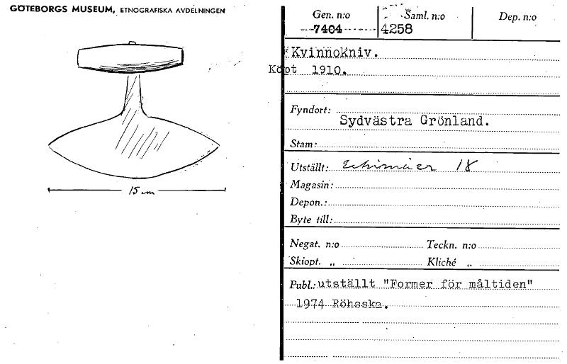• GOTEBORGS MUSEUM,. ETNOGRAFISKA AVDELNINGEN Gen. n:o •Saml. n:o 404 - - 4258 Dep. n:o vinnokniv. 1910 Fyndort: Sydvästra Grönland. Stam: Utställt. Magasin: Depon.: Byte till: Negat. n:o Teckn. n:o Sk... Visa hela