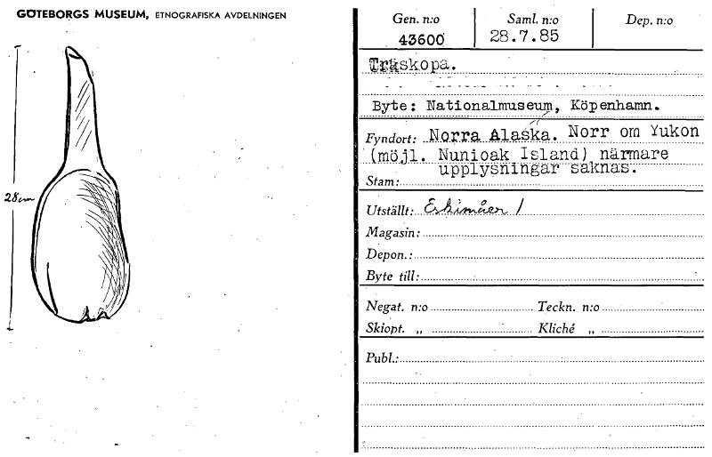 GOTEBORGS MUSEUM, ETNOGRAFISKA AVDELNINGEN Byte: Nationalmuseum, Köpenhamn. NOTra Alaska. Norr om Yukon Fyndort: (möjl. Nunioak Island) närmare upplysningar saknas. Stam • Utställt: ,-&/:449.,Ze^, Ma...