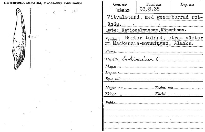 GOTEBORGS MUSEUM, ETNOGRAFISKA AVDELNINGEN Gen. n:o 43653 Saml. 28.8.38 Dep. n:o Vitvalstand, med genomborrad rot- ända. Byt e : N at i on alnnis etun , Kö,penhamn Fyndort: Barter Island, strax väste...