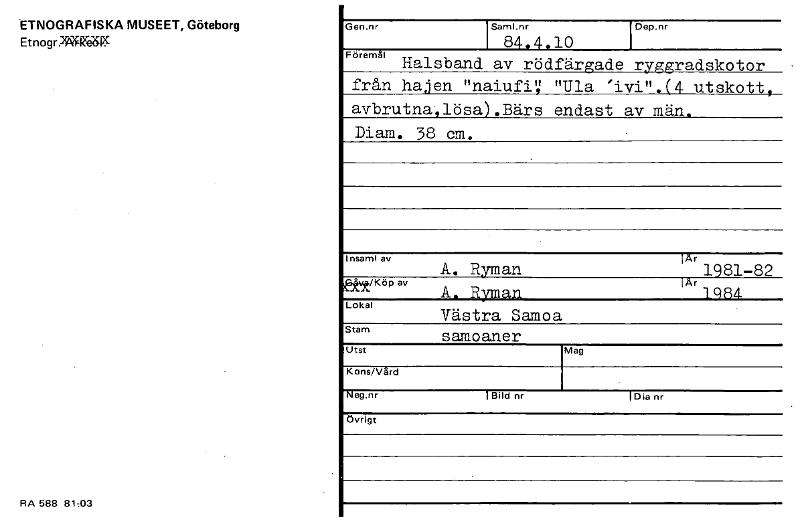 ETNOGRAFISKA MUSEET, Göteborg Etnogr.Y4K4K RA 588 81,03 Gen.nr Saml.nr 84.4.10 Dep.nr Föremal Halsband av rödfärgade ryggradskotor från hajen "naiufr: "Ula 'ivi".(4 utskott, avbrutna,lösa).Bärs endast av män. Diam. 38 cm. Insaml av i Ar A. Ryman 1981-82 : '215r5t. /Köp av lÄr A. Ryman 1 q84. Lokal Västra Samoa Stam samoaner Utst Mag Kons/Vård Neg nr 1 Bild nr [Dia nr Övrigt [ocr]