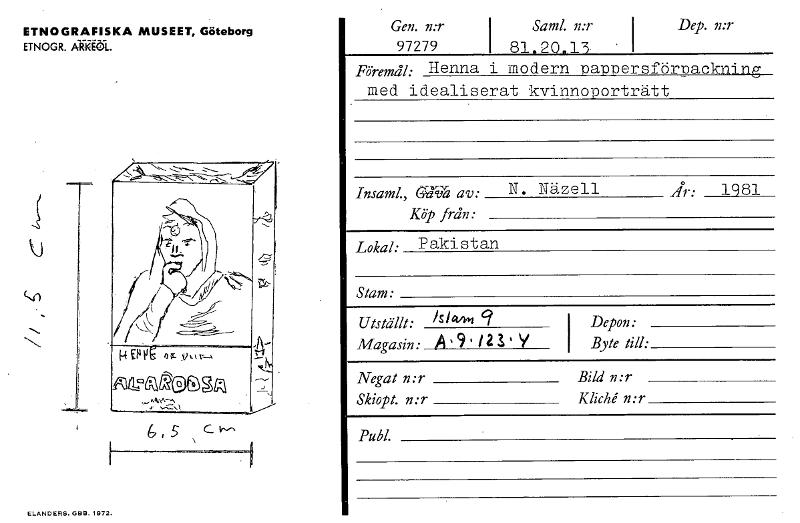 • ETNOGRAFISKA MUSEET, Göteborg ETNOGR. A1ti�E ii. 6,S ELANDERS.GBEL1972. Gen. n:r 97279 Saml. n:r I 81.20.13. Dep. n:r Föremål• Henna i modern pappersförpackning med idealiserat kvinnoporträtt Insaml.,... Visa hela