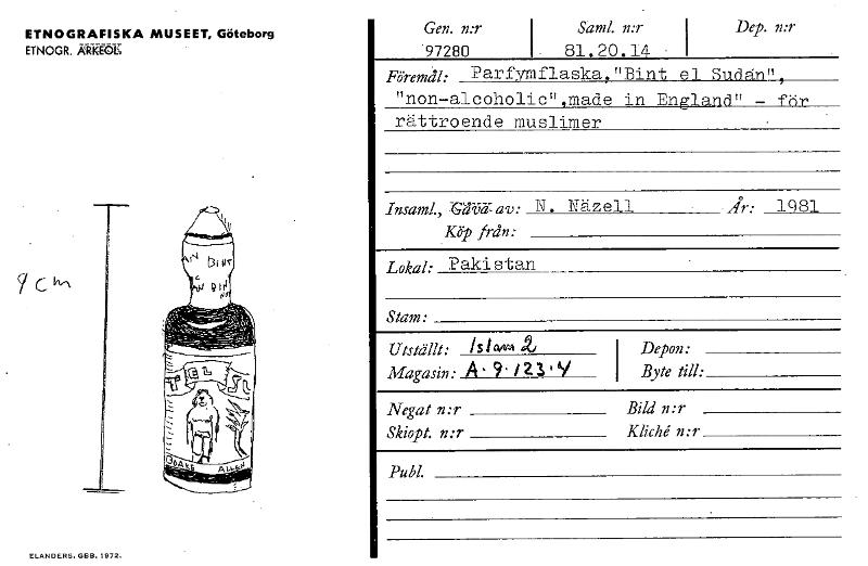 ETNOGRAFISKA MUSEET, Göteborg ETNOGR. ARKE-OE ELANDERS. GBB. 1972. Gen. n:r Sand. n:r 97280 i- 81.20.14 Dep. n:r Föremål: Parfymflaska, "Bin.t el Sudän" , "non—alcoholic" ,made in England" — fhr rättr...