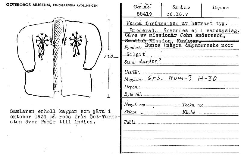 GOTEBORGS MUSEUM, ETNOGRAFISKA AVDELNINGEN Samlaren erhöll kappan som gåva i oktober 1934 på resa från Öst-Purke stan över Pamir till Indien. -- -- Gen..n:6- 58419 Saml. n:o 36.16.7 Dep. n:o _rappa förfärdigad av hOmvävt tyg. Broderad.• Användes ej i vardagslag. Gåva av missionär John Andersson, . --Zwadish-llission,, Ifaahger Fyndort: Hunza (nagra dagsmarsehe norr G.iigi t Stam. dexrder? Utställt: Magasin: ' 6 r--5 - g i) 141 - 3 H 3 D Depon.: Byte till: Negat. n:o Teckn. n:o Skiopt. „ • KlicU „ PUH: [ocr]Stäng