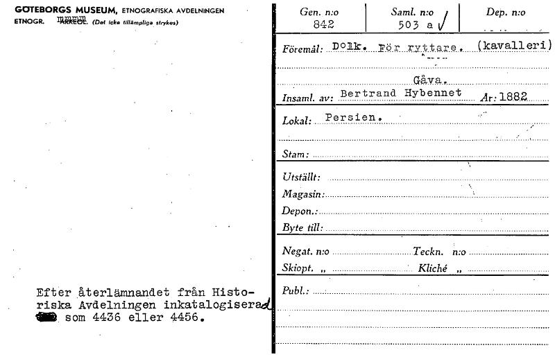 • GOTEBORGS MUSEUM, ETNOGRAFISKA AVDELNINGEN ETNOGR. (Det Icke fillåmpliga strykes) Gen. n:o Saml. n:o j Dep. n:o 842 503 a i/ _ _ Föremål: Dolk. _rör ryttare. (kavalleri) eri ) Gåva. Insaml. av: Ber... Visa hela