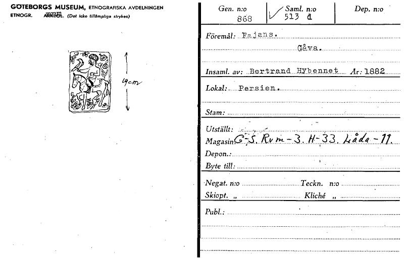 • GOTEBORGS MUSEUM, ETNOGRAFISKA AVDELNINGEN ETNOGR. (Det icke tillämpliga strykas) Gen. n:o Saml. n:o 868 V 513 d. Dep. n:o Föremål: Vs:j ans I i Insaml. av: ..Be.rtnand Hyb en.n.et Lokal: Stam: Är: 1... Visa hela
