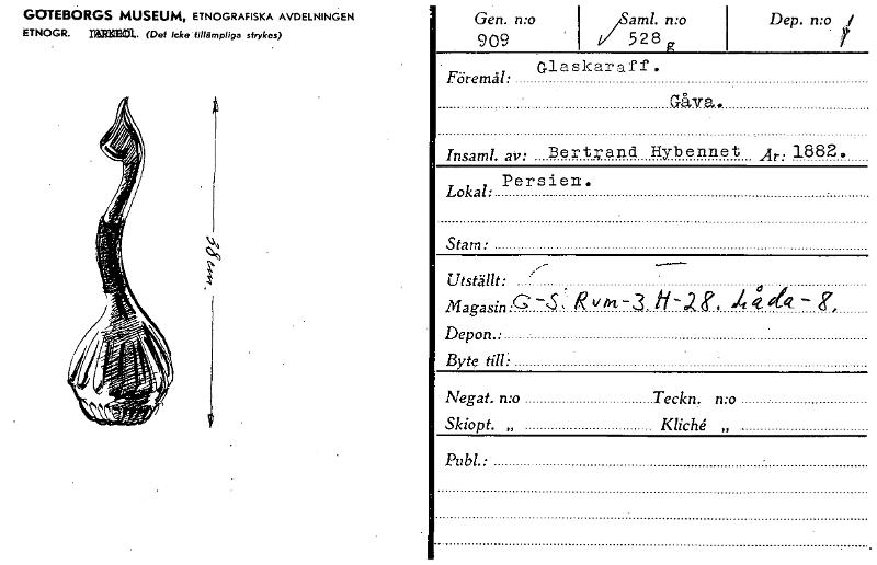 • 9 GOTEBORGS MUSEUM, ETNOGRAFISKA AVDELNINGEN ETNOGR. ~EM. (Det !eke tillämpliga strykas) Gen. n:o 909 aml. n:o 528 g Dep. n:o 1 Glaskaraff . Föremål: Gåva., Insaml. av: Bertrand Hybennet Är 1882. Pe... Visa hela