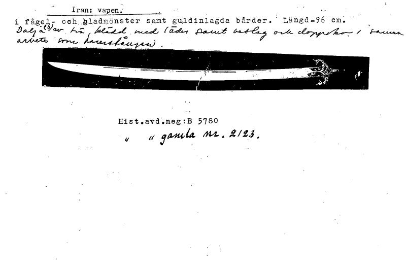 • Iran: vapen.- i fågel- och bladmönster samt guldinlagda bårder. Längd-96 cm. Balja (b) av trä, klädd med läder samt beslag och doppsko. Samma arbete som [ocr]