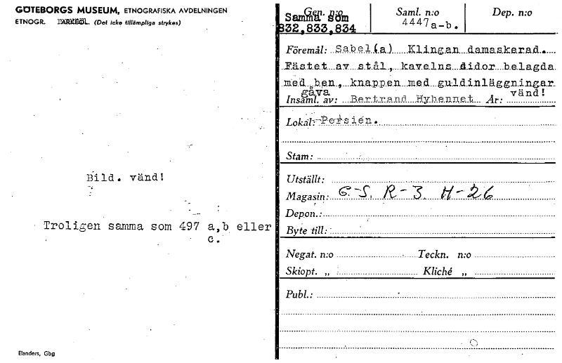 • GOTEBORGS MUSEUM, ETNOGRAFISKA AVDELNINGEN ETNOGR. rAwiatit. (Det icke tillämpliga strykes) Bild. vänd! Troligen samma som 497 a,b eller c. Elandes, Gbg s ÄH' iii% :32,833,834 Sam!. n:o 4447a_b. Dep. ... Visa hela