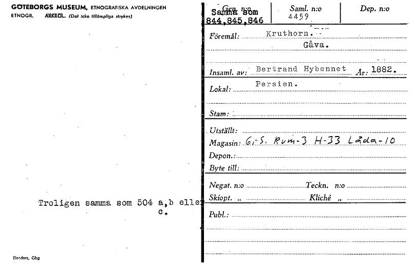 GOTEBORGS MUSEUM, ETNOGRAFISKA AVDELNINGEN ETNOGR. ÄRKtrit. (Def Icke tillämpliga strykas) Troligen samma som 504 a,b ell c. Elandars, Gbg SaiC tähn 844,845,846 Saml. n:o 4459 Dep. n:o -..... Föremål:...