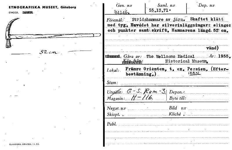 ETNOGRAFISKA MUSEET, Göteborg ETNOGR. Gen. n:r b4-146°. Sam!. n:r 55.13.71 • .Dep. n:r E5i-emål:—Stridsharnmare av järn. Skaftet klätt med: tygT. Huvudet har silverinläggningar:: alingox och punkter samti., skrift. Hammarens längd, 5r ci41 vänd) c/rt_ - nimmetti, Gåva av: ....The... Weil° orre../Te.dical Historical Museum, • 4 . fEl 1114 tum Lokal: Främre Orienten, t. ex. Persien. (Efter— bestämning.) IRAN Stam: uts it: - /etern_ -3, Magasin: bi- Depon.: Byte till: Negat. n:r Bild n:r Skiopt. • Kliché Publ. ELANDERS, DOG 502. 1 I. 53. [ocr]