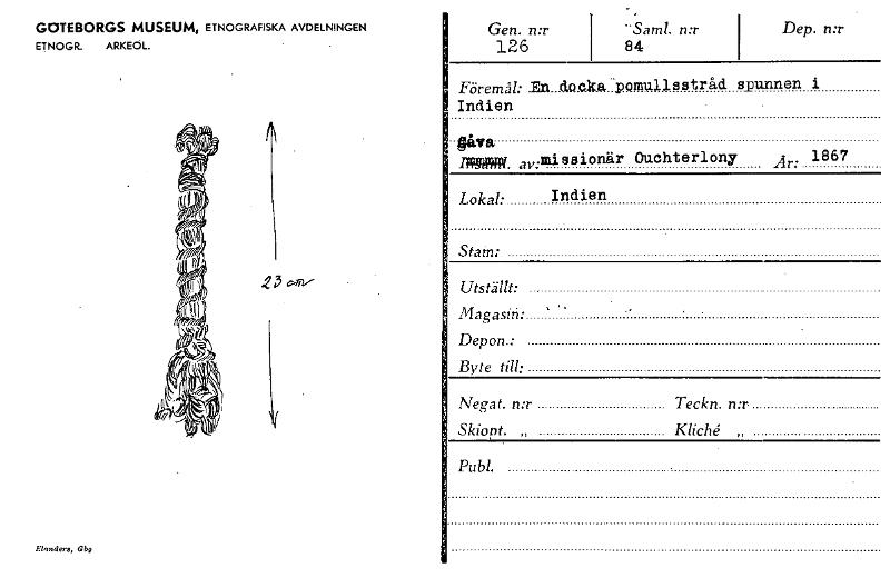 • GOTEBORGS MUSEUM, ETNOGRAFISKA AVDELNINGEN ETNOGR. ARKEOL. Gen. n:r 126 "Saml. n:r 84 Dep. n:r Föremål: .En.d.Q.cks,:loomullsstråd spunnen i Indien Lokal: Indien Stain: Utställt: , Magasin: Depon • B... Visa hela