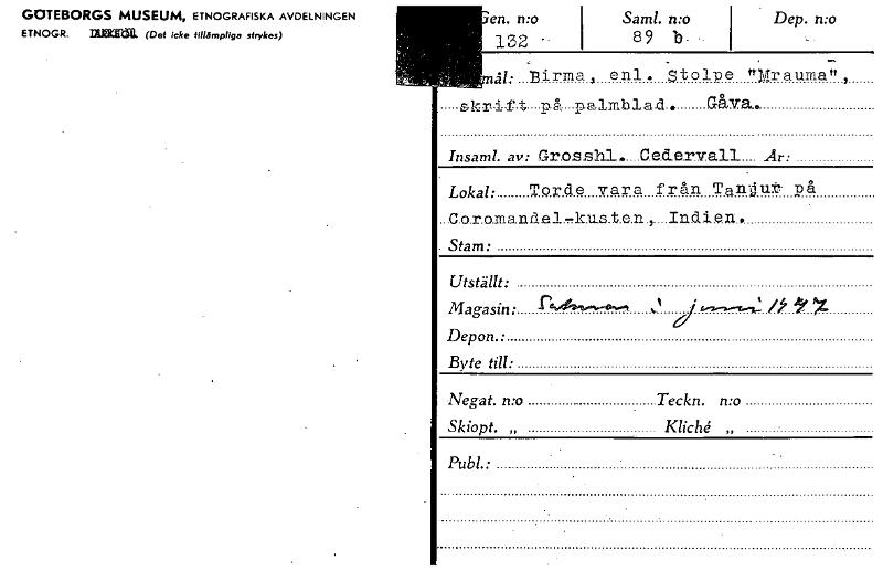 GOTEBORGS MUSEUM, ETNOGRAFISKA AVDELNINGEN ETNOGR. DUMOSik (Det icke tillåmpliga strykas) en. n:o Saml. n:o Dep. n:o 132 89 b- • Y, åh nirma, enl. $tolPe olgrauman, skr3-f t. tyå -palmbla -d.. Gåva.. Insaml. av: Gr.osshl... Är: Lokal: Torde vara från Tanlut på .Goramandel..nhu&tan, Stam: Utställt: Magasin: ,1 ik Depon.: Byte till: Negat. n:o Teckn. n:o Skiopt. „ Kliché „ Publ.: [ocr]