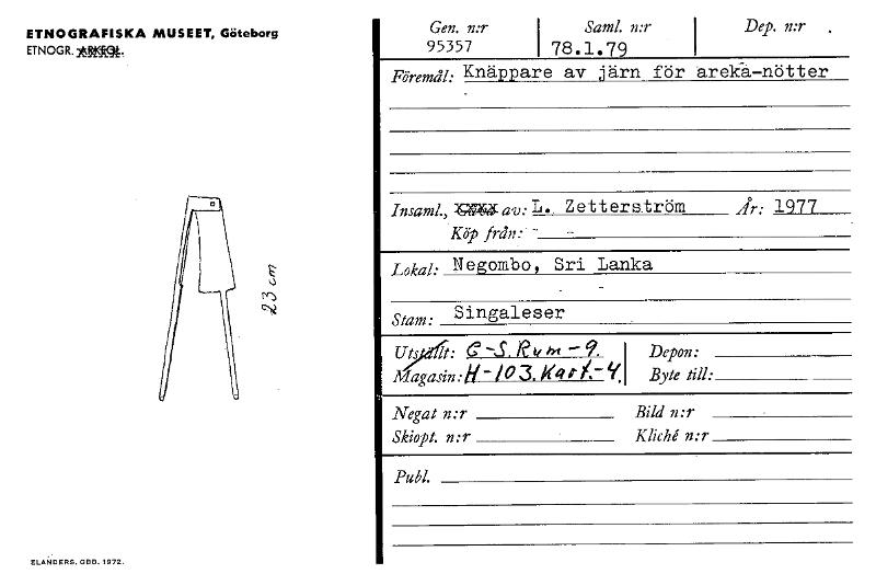 • ETNOGRAFISKA MUSEET, Göteborg ETNOG R. Agigt. ELAN.DERS.G1313.1972. Gen. n:r 95357 i 78. Sia.m719. n:r Dep. n:r i Föremål. Knäppare av järn för arekä—nötter huami,~av.L. Zetterström jr: 1977 Köp från ... Visa hela