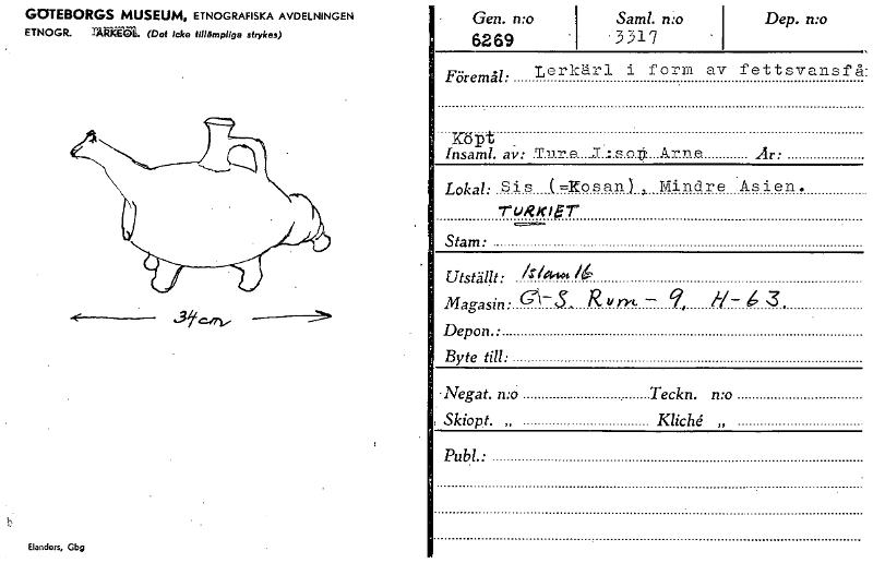• b GOTEBORGS MUSEUM, ETNOGRAFISKA AVDELNINGEN ETNOGR. rÄkkE"Ol. (Det icke tillämpliga strykas) Elanders, Gbg • Gen. n:o Sam!. n:o 6269 1 • 3317 Dep. n:o Föremål: Lerkärl i form Köpt _ Insaml. av: .T.u... Visa hela
