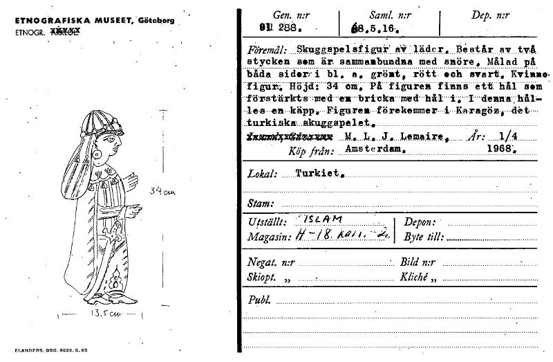ETNOGRAFISKA MUSEET, Göteborg ETNOGR. geggff ELANDEIRS.~9626.6.65 Gen. n:r 911 288, , Saml. n:r I 68,5,19, I Dep. n:r Föremål: SkuggspeltifigUr" aV 'läder. Består av ty. stycken som är sammanbundna med snöre. Målad på båda sidor-i bl. a. grönt, rött. •ch svart„ Kvini 'figur, Höjd: 34 cm. På figuren finns ett häl sol förstärktssinedon-bricka-med...hål i. I dennal.håll ..les-enkäpp...-figurea...förekommer i Karagöz, det .turki.ska,...skuggopelet. g~tivizia« ÅL It.. J. .lemaire., År: 1/4 Köp från: Amsterdam. 1968, Lokal: Turkiet. • • • Stam: Utställt: -- -1i-kfrt — Magasin: /8 Åå'' i • °4-.1 I Depon: • Byte till: Negat. n:r • Bild n:r. Skiopt. „ • Kliché,, Publ. • • • 3 LicAk, [ocr]