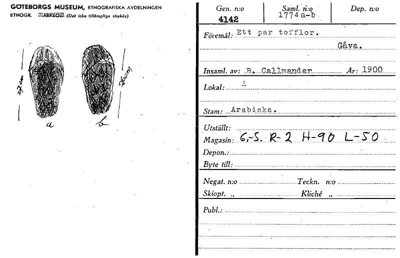 • GOTEBORGS MUSEUM, ETNOGRAFISKA AVDELNINGEN ETNOGR. ~a (Det Icke tillämpliga stryks) Gen. n:o 4142 Sam!. 1774a—b.. Dep. n:o Cl- Föremål: Ett par tofflor. Gåva. Ensam!. av: ..B.. C.a.1 and_ e T' Är: 19... Visa hela