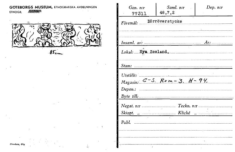 • GOTEBORGS MUSEUM, ETNOGRAFISKA AVDELNINGEN ETNOGR. /1111~ G_en. n:r 77311 Saml. n:r 48.7.2 Dep. n:r Föremål: Insaml. Dörröverstycke År: Lokal: Stam: Nya zeoland. Magasin: Utställt: Depon.: Byte till:... Visa hela
