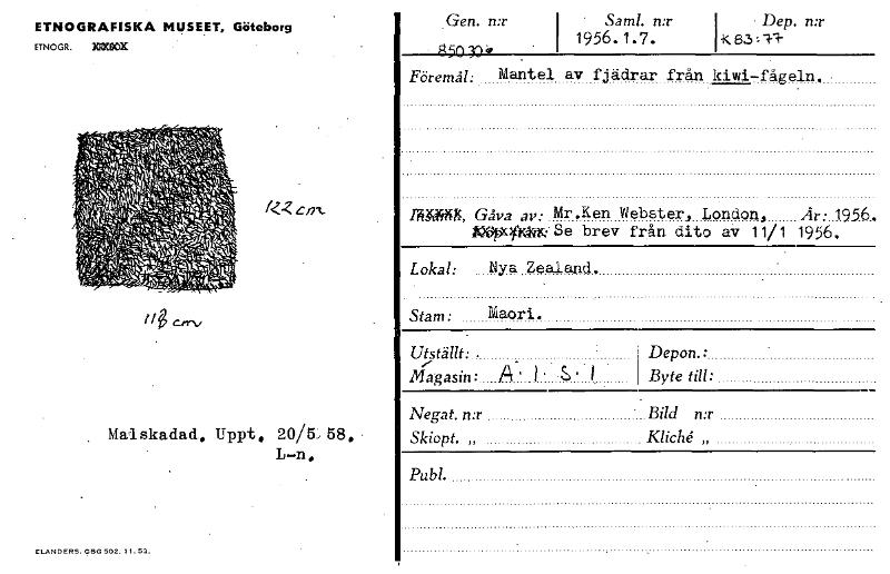 • ETNOGRAFISKA MUSEET, Göteborg ETNOGR. 205CGOX .Gen. n:r 5C) n'y Sam!. fur 1956.1.7. Dep. n:r -K Föremål: Mantel av fjädrar från kiwi-fågeln. /Z-Zcn-t.. tig, Mal skadad, Uppt, 20/5, 58, L-n, ffigchiCK... Visa hela